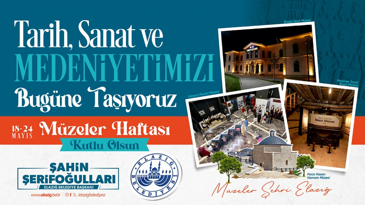 Elazığ Belediye Başkanı Şahin Şerifoğulları, 18-24 Mayıs Müzeler Haftası dolayısıyla bir mesaj yayımladı. Başkan Şerifoğulları mesajında 'Müzeler Şehri Elazığ' projemiz doğrultusunda Musiki Müzemizi, Basın Müzemizi, Hoca Hasan Hamam Müzemizi ve Kent Müzemizi aziz şehrimize kazandırmanın gurur ve mutluluğunu yaşıyoruz.' dedi.
