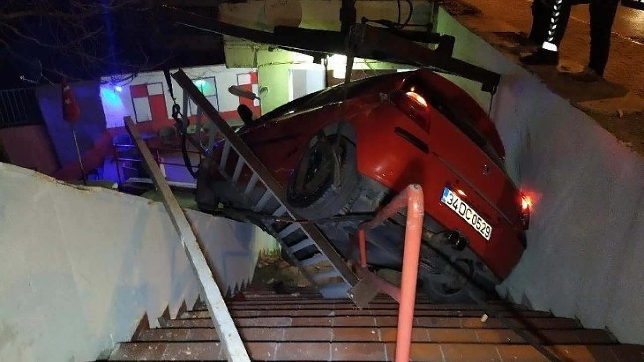 Beyoğlu'nda sürücüsünün kontrolünden çıkan otomobil, kaldırımdaki bariyerle kırıp çay bahçesinin merdivenlerine düştü. O sırada kimsenin bahçede olmaması kimse yaralanmadı.