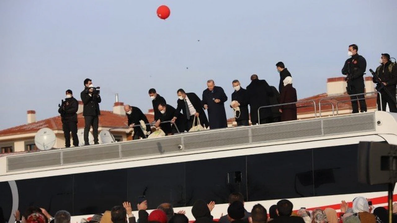 Elazığ’a gelen Cumhurbaşkanı Recep Tayyip Erdoğan, Elazığ depreminin 1. yıl dönümü nedeniyle düzenlenen anma ve deprem konutları anahtar teslim törenine katılmak üzere Elazığ’a geldi. Uçakla Elazığ Havalimanına gelen Cumhurbaşkanı Erdoğan, Çevre ve Şehircilik Bakanı Murat Kurum’la helikoptere geçerek, kentte yapılan çalışmaları yaklaşık yarım saat havadan inceledi. Erdoğan ardından merkeze bağlı Yazıkonak beldesinde deprem konutları teslim töreni alanına geçti. Cumhurbaşkanı Erdoğan, burada bekleyen vatandaşlara otobüs üzerinden açıklamada bulundu.