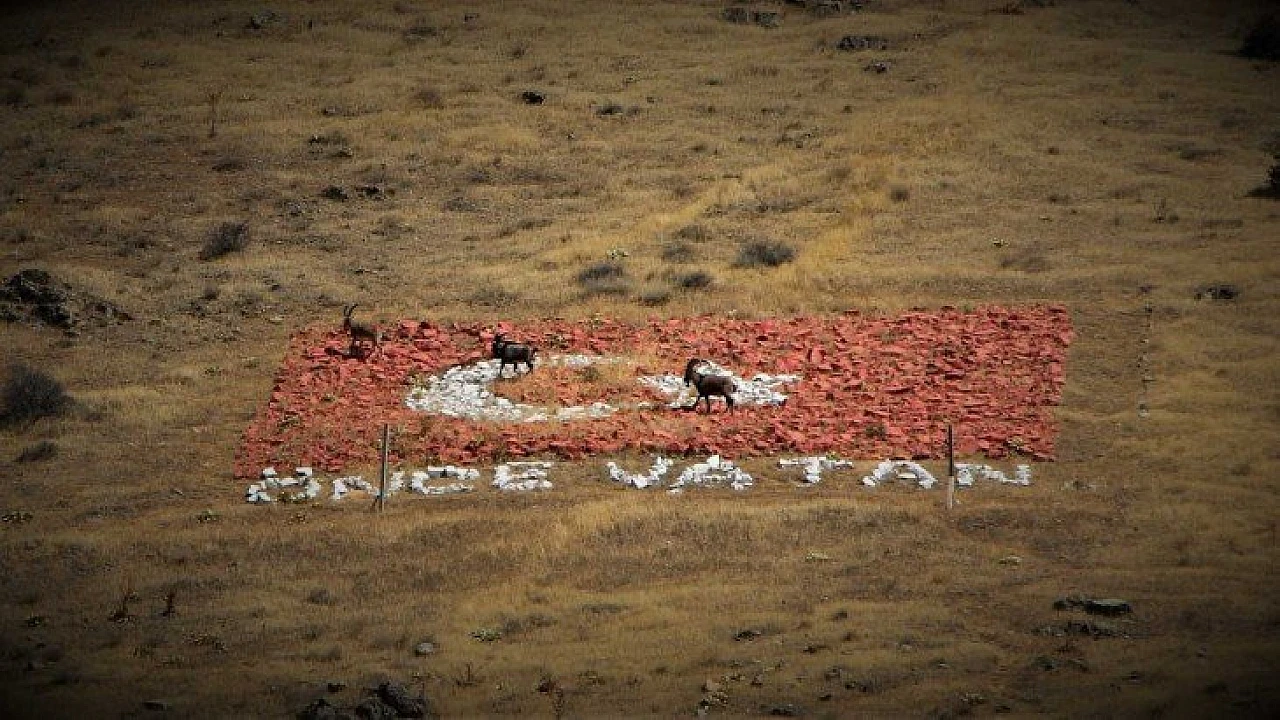 Dağ keçilerinin, Elazığ'da 16 şehri birbirine bağlayan Kömürhan Köprüsü mevkiinde taşlarla oluşturulan Türk bayrağı ile bir kareye girmesi güzel görüntü oluşturdu. Bu sırada bölgeden geçen bir bir sürücünün keçilere seslenmesi gülüşmelere neden oldu.