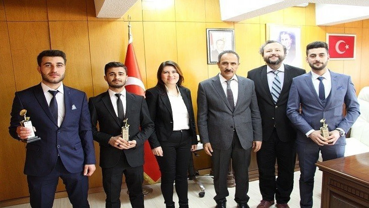 Genç İletişimciler Yarışmasında dereceye giren öğrenciler, Fırat Üniversitesi Rektörü Prof. Dr. Kutbeddin Demirdağ'ı makamında ziyaret etti.