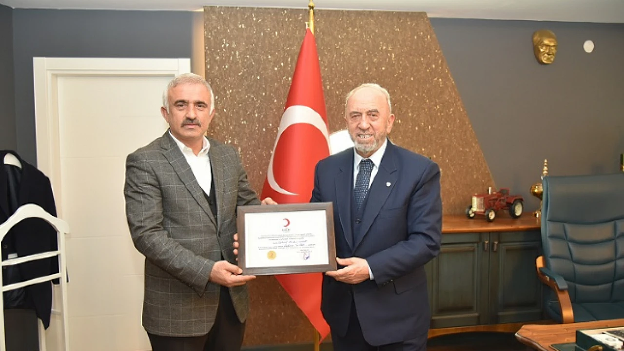 Türk Kızılay'ı Elazığ Şube Başkanı Rahman Kızılkaya, Elazığ Ticaret Borsası Başkanı Mehmet Ali Dumandağ'a ''Filistin'e yardım'' etkinliğine verdiği destekten dolayı plaket taktim etti.