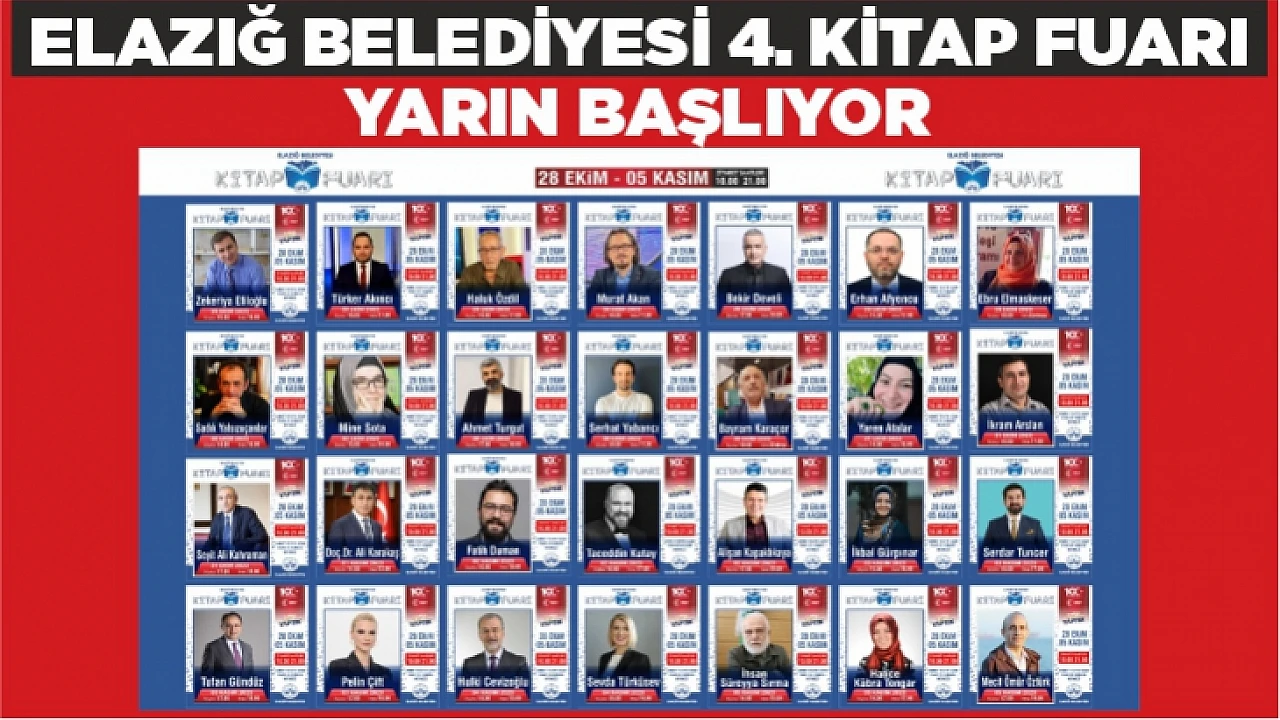 Elazığ Belediyesi tarafından Ahmet Tevfik Ozan Fuar ve Kongre Merkezi'nde organize edilecek olan 4. Kitap Fuarı, yarın başlayacak. Birbirinden kıymetli şair ve yazarların okuyucularla buluşacağı fuar, 9 gün boyunca devam edecek.