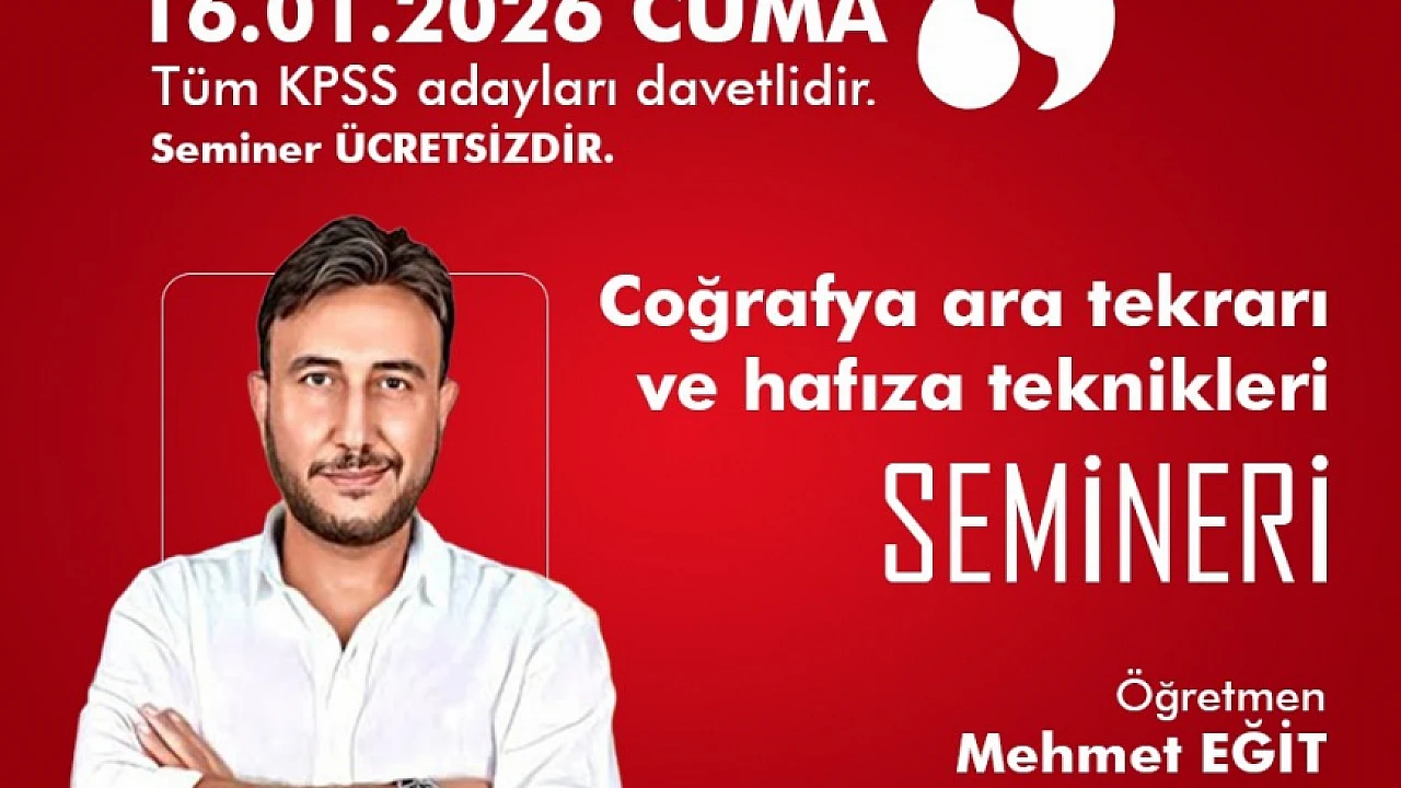 Bu doğrultuda Elazığ Belediyesi tarafından KPSS adaylarına yönelik coğrafya ara tekrarı ve hafıza teknikleri semineri düzenlenecek. Eğitimci Mehmet Eğit’in gerçekleştireceği seminer, 16 Ocak Cuma günü 13.30-16.30 saatleri arasında Ahmet Tevfik ozan Fuar ve Kongre Merkezi’nde yapılacak. Seminere katılmak isteyen gençler, 04242188800 numaralı telefondan bilgi alabilecek.