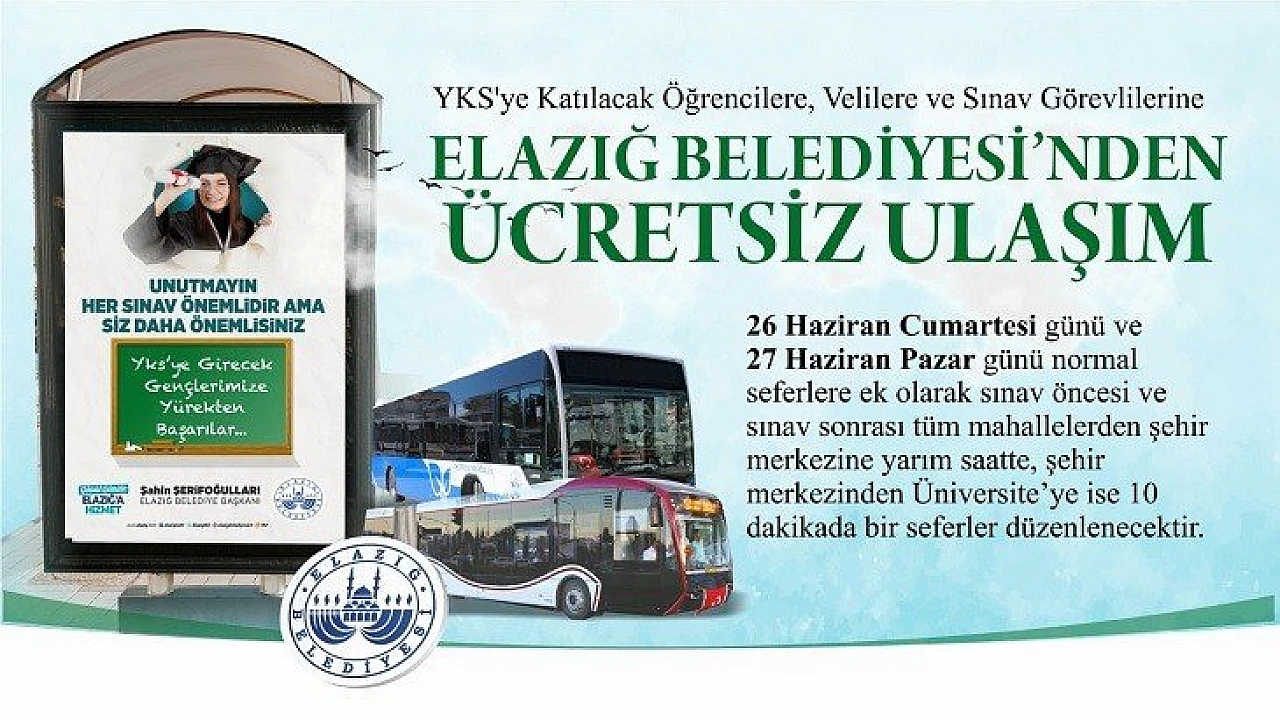 Elazığ Belediyesi, 26-27 Haziran'da gerçekleştirilecek Yükseköğretim Kurumları Sınavı'na (YKS) girecek öğrenciler, velileri ve sınav görevlileri için ücretsiz toplu taşıma hizmeti sunacak.