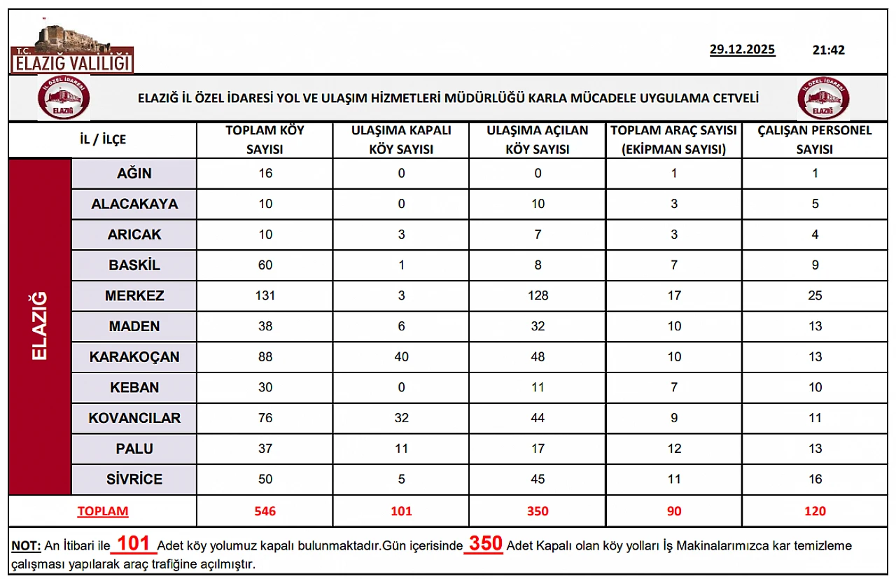 Elazığ İl Özel İdaresi köy yollarında kar küreme çalışmalarını sürdürüyor. Bu kapsamda ekipler tarafından gün içerisinde ulaşıma kapalı olan 350 köy yolu tekrar ulaşıma açıldı.