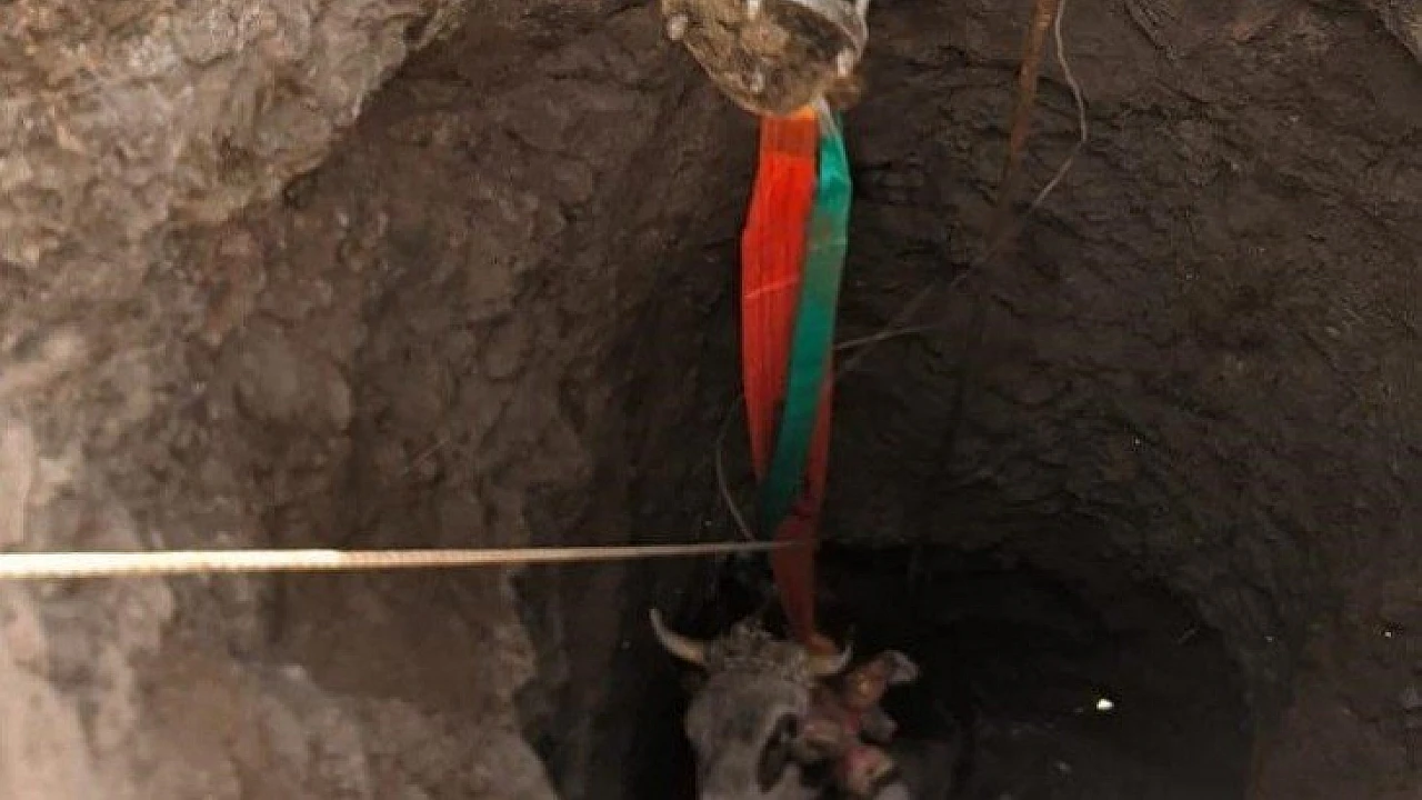 Elazığ'da 14 metrelik su kuyusuna düşen gebe inek, hayvan boğulmadan yetişen itfaiye ekiplerinin 1 saatlik çabasıyla sağ olarak kurtarıldı.