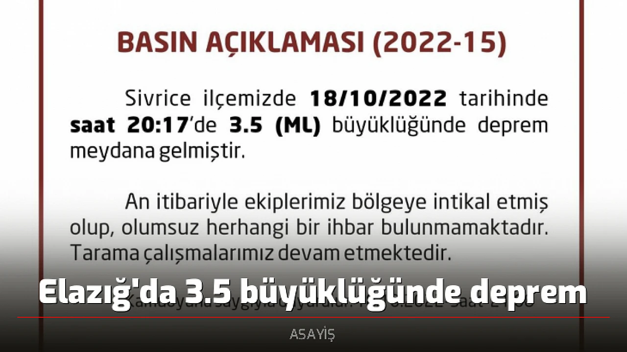Elazığ Valiliği tarafından yapılan açıklamada, “Sivrice ilçemizde 18 Ekim 2022 tarihinde saat 20.17de 3.5 büyüklüğünde deprem meydana gelmiştir. An itibariyle ekiplerimiz bölgeye intikal etmiş olup, olumsuz herhangi bir ihbar bulunmamaktadır. Tarama çalışmalarımız devam etmektedir" denildi.