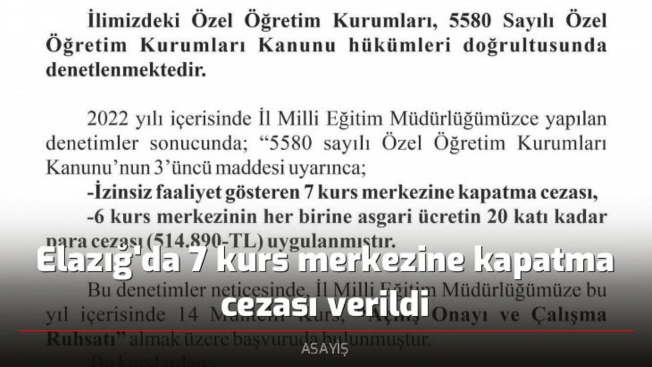 Elazığ’da 7 kurs merkezine kapatma cezası verilirken, 6 kurs merkezine ise 514 bin 890 TL para cezası kesildi.