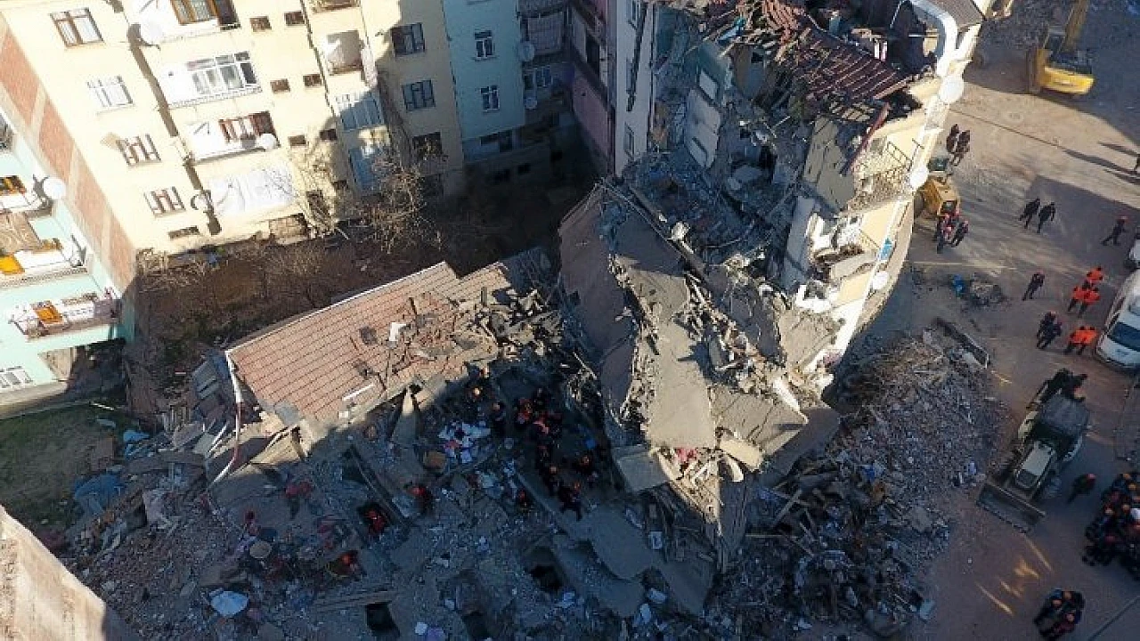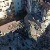 Elazığ'ın Sivrice ilçesi merkezli 6,8 büyüklüğündeki depremin ardından Mustafa Paşa Mahallesi'nde yıkılan binanın enkazında yapılan arama kurtarma çalışmaları drone ile havadan görüntülendi.