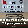 Elazığ'da son bir hafta içerisinde gerçekleştirilen asayiş ve şok uygulamalarında aranan veya meydana gelen asayiş olaylarının şüphelisi olduğu tespiti ile toplam 132 şahıs yakalandı.