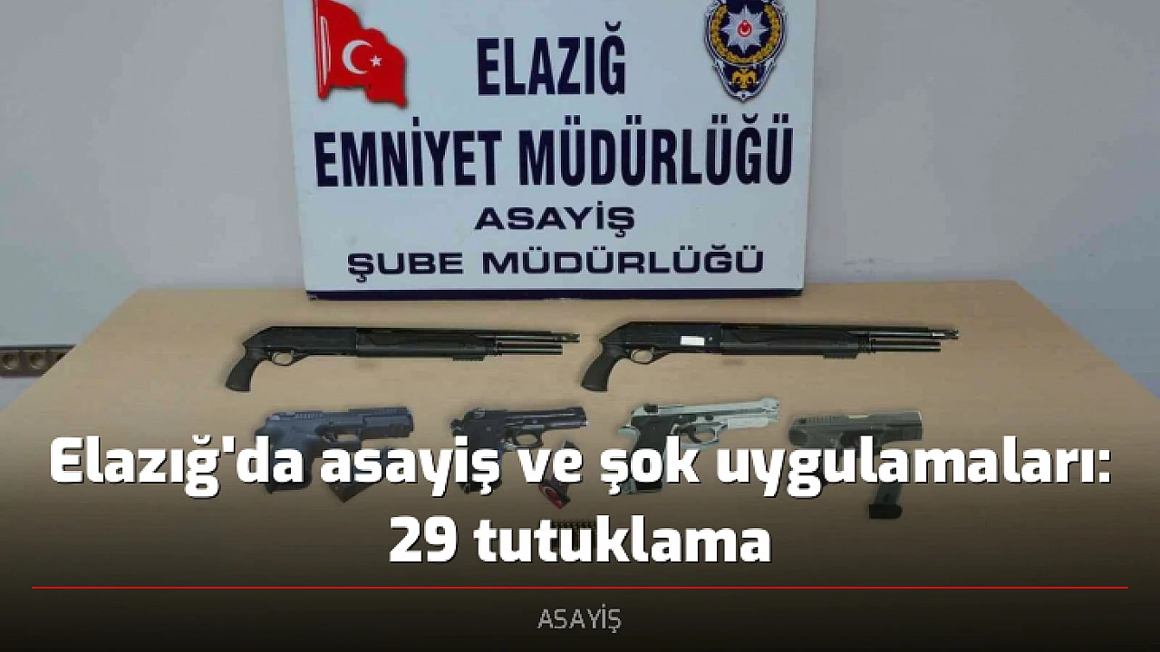 Elazığ İl Emniyet Müdürlüğünce kent genelinde son bir hafta içerisinde asayiş ve yunus ekipleri tarafından gerçekleştirilen asayiş ve şok uygulamalar neticesinde, aranan veya meydana gelen asayiş olaylarının şüphelileri yakalandı. Yakalanan şahıslardan 29’u tutuklanarak cezaevine gönderildi. Uygulamalarda kayıp olarak aranan 11 şahıs bulunarak gerekli işlemler yapılırken, denetimler esnasında ise 4 adet ruhsatsız tabanca ve bu tabancalara ait 45 adet fişek, 2 adet pompalı tüfek, 77,3 gram esrar, 4 gram metamfetamin ele geçirildi.