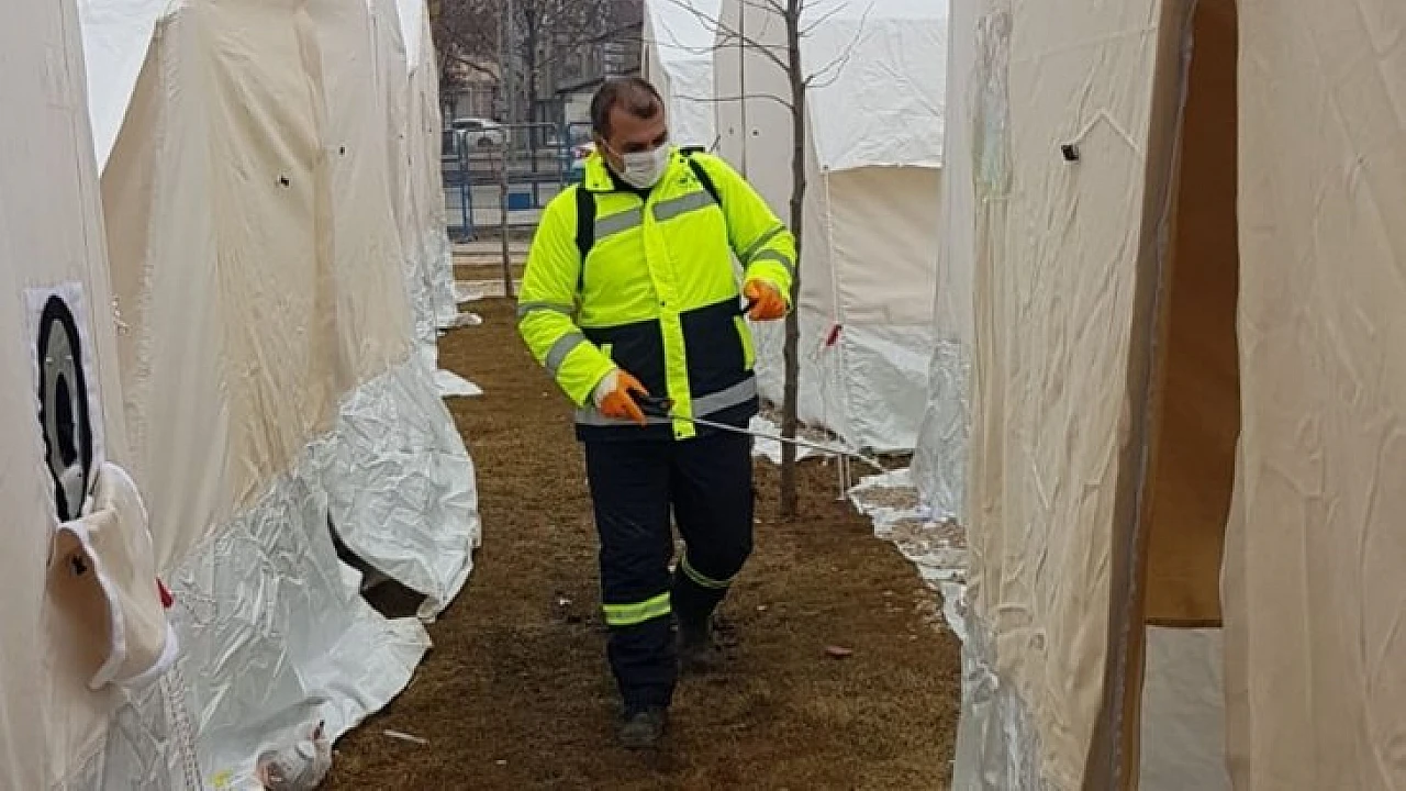 Belediyeden yapılan açıklamada," Şehrimizde yaşanan depremin ardından kurulan çadır alanlarında herhangi bir olumsuzluk yaşanmaması amacıyla ekiplerimiz tarafından başlatılan dezenfekte işlemi devam ediyor. Ekiplerimiz tarafından virüs, bakteri ve mantara karşı yapılan ilaçlama çalışmaları şehir genelinde rutin olarak devam edecek olup, vatandaşlarımızın çadır kurulan alanlarda çöp ve benzeri atıkları alanda bulunan kovalara atmaları gerekmektedir"denildi.