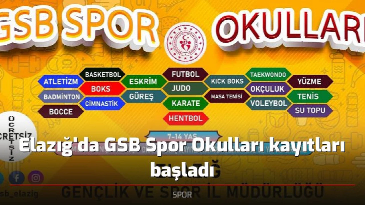 Gençlik ve Spor Bakanlığı tarafından her yıl 81 ilde düzenlenen GSB Spor Okulları ve GSB Engelsiz Spor Okulları kayıtları Elazığ’da da başladı. Elazığ Gençlik ve Spor İl Müdürlüğü tarafından yaz döneminde 20 farklı branşta ücretsiz olarak verilecek spor eğitimleri çocukların ve gençlerin bilişsel, sportif gelişimleri ile sosyalleşmelerine katkı sağlayacak. Spor tesislerinde antrenörler eşliğinde verilecek olan eğitimler ile 7-14 yaş arasındaki çocuklar ve gençler, ücretsiz spor yapma imkanı bulacak. Kayıtların Gençlik ve Spor İl Müdürlüğü Sportif Değerlendirme ve Takip Birimi tarafından alınacağı bildirildi.