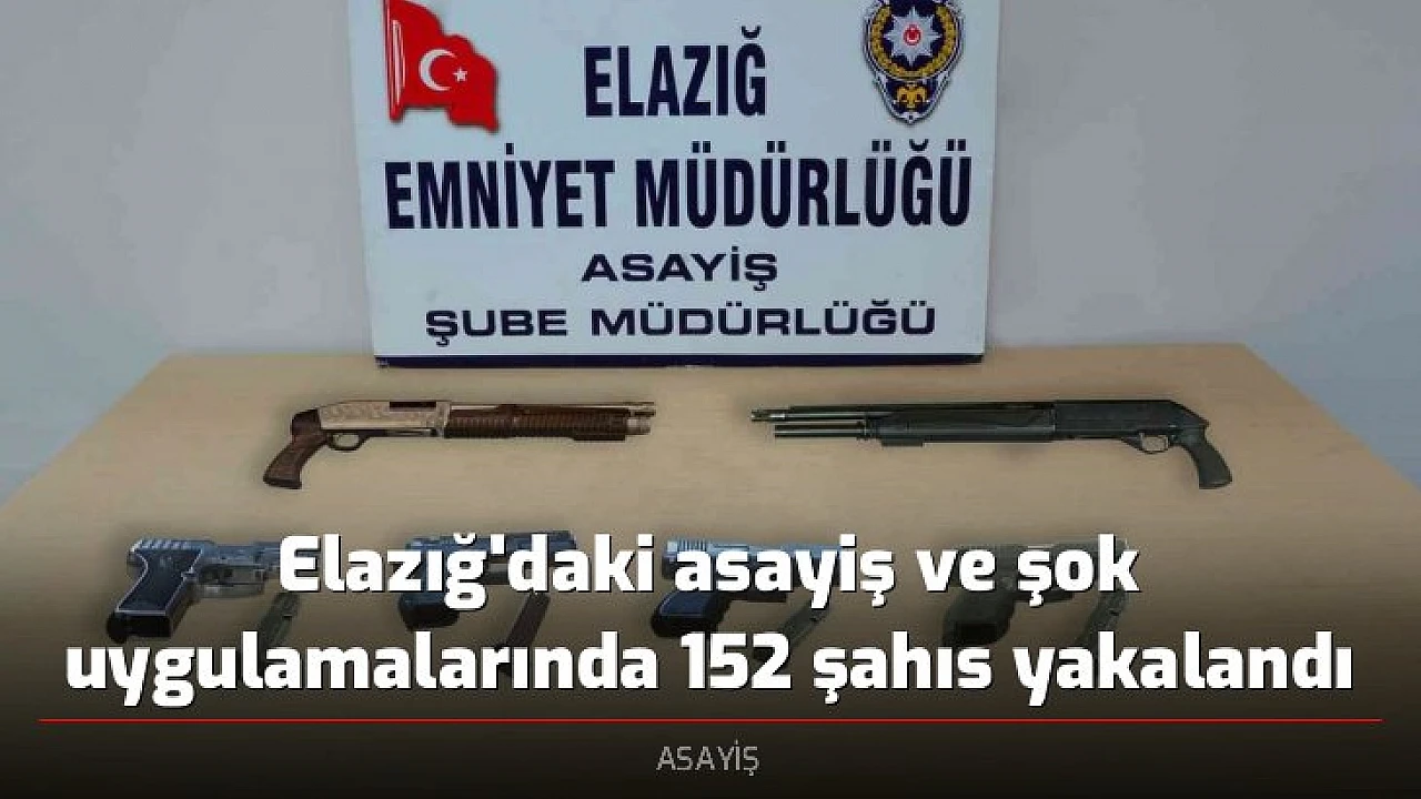 Elazığ İl Emniyet Müdürlüğünce kent genelinde son bir hafta içinde gerçekleştirilen asayiş ve şok uygulamalarında, aranan veya meydana gelen asayiş olaylarının şüphelisi olduğu tespit edilen 152 şahıs yakalandı. Bu şahıslardan 25’i sevk edildikleri adli mercilerce tutuklanarak cezaevine gönderildi. Uygulamalarda ayrıca kayıp olarak aranan 8 kişi de yakalanırken, 4 adet ruhsatsız tabanca, 2 adet tüfek, çeşitli tür ve miktarlarda uyuşturucu madde ele geçirildi. Çalıntı olduğu belirlenen bir motosiklet de sahibine teslim edildi.