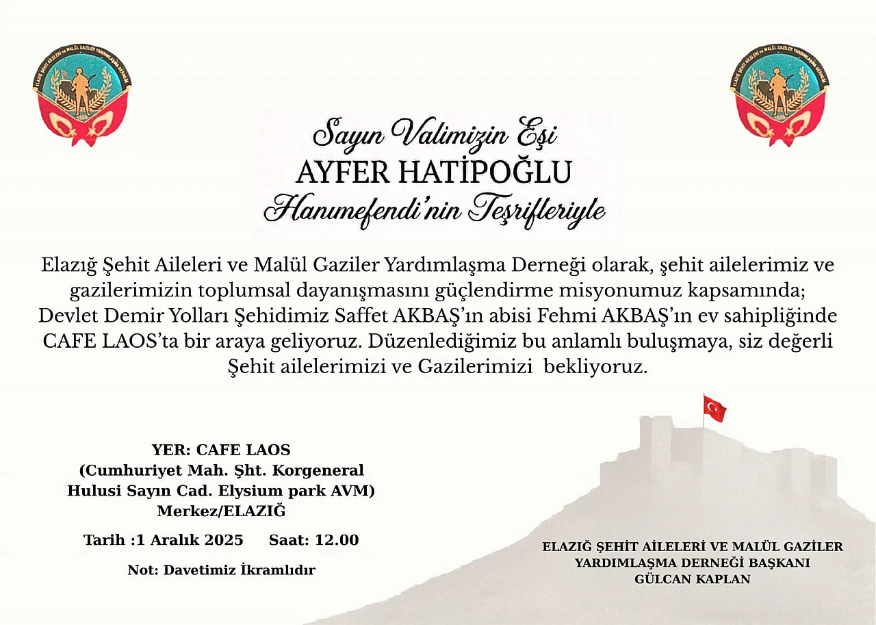 “Elazığ Şehit Aileleri ve Malül Gaziler Yardımlaşma Derneği olarak, şehit ailelerimiz ve gazilerimizin toplumsal dayanışmasını güçlendirme misyonumuz kapsamında; Devlet Demir Yolları Şehidimiz Saffet Akbaş’ın ağabeyi Fehmi Akbaş’ın ev sahipliğinde bir araya geliyoruz. Cafe Laos’ta düzenlenecek bu anlamlı buluşmaya şehit ailelerimizi ve gazilerimizi bekliyoruz.”