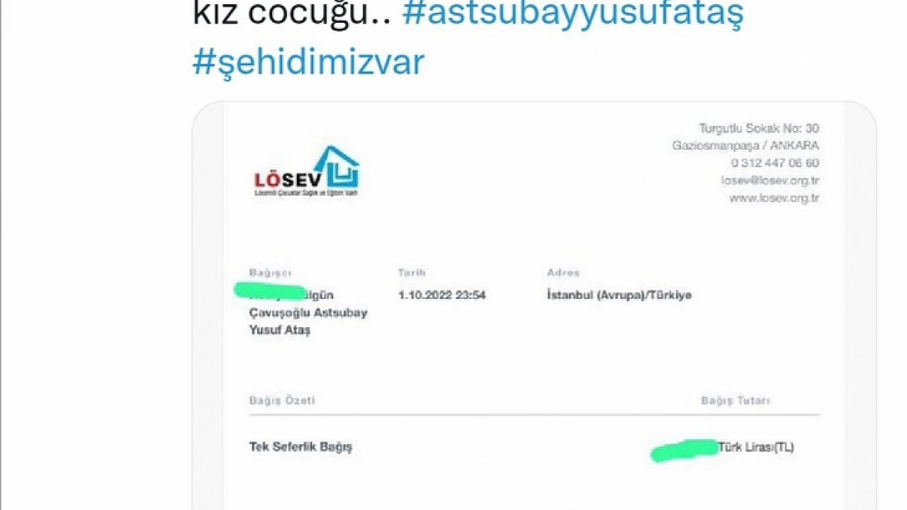 Bunun üzerine LÖSEV ise sosyal medya üzerinden yaptığı paylaşımda, “Vatan için gözünü kırpmadan şehitlik mertebesine yükselirken lösemili çocuklarımızı kalbinde taşıyan Mehmetçiğimizin vasiyetini yerine getirmek boynumuzun borcudur. Pençe - Kilit operasyon bölgesinde şehit düşen Astsubay Yusuf Ataş’a Allah’tan rahmet, ailesine ve milletimize başsağlığı dileriz” ifadelerini kullandı.