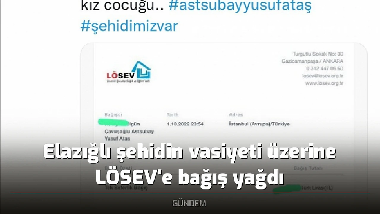 Pençe-Kilit operasyon bölgesinde şehit düşen Piyade Astsubay Yusuf Ataş’ın vasiyeti sonrası LÖSEV’e bağış yağdı.