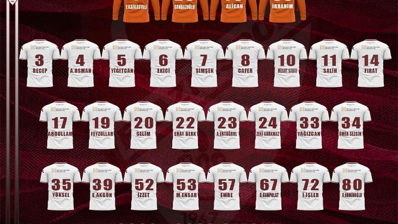 "Yiğit Kafkasyalı (1), Hakan Canbazoğlu (26), Ali Can (78), İbrahim Akdaş (99), Recep Yurdakul (3), Ali Osman Döner (4), Yiğitcan Erdoğan (5), Hasan Ekici (6), Hakkı İsmet Şimşek (7), Cafer Tosun (8), Mesut Saray (10), Salih Polatdemir (11), Fırat Ergün (14), Abdullah İçen (17), Feyzullah Şahin Güneş (19), Selim Enes Özeren (20), Eray Berk Şimşek (22), Ahmet Ertuğrul Öztürk (23), Zeki Korkmaz (24), Yağızcan Erdem (33), Ömer Faruk Sezgin (34), Yüksel Kayaalp (35), Emre Akgün (39), İzzet Topatar (52), M. Ensar Çavuşoğlu (53), Emre Yıldız (57), Cihan Canpolat (67), İbrahim İşler (72), Ahmet Ormanoğlu (80)."