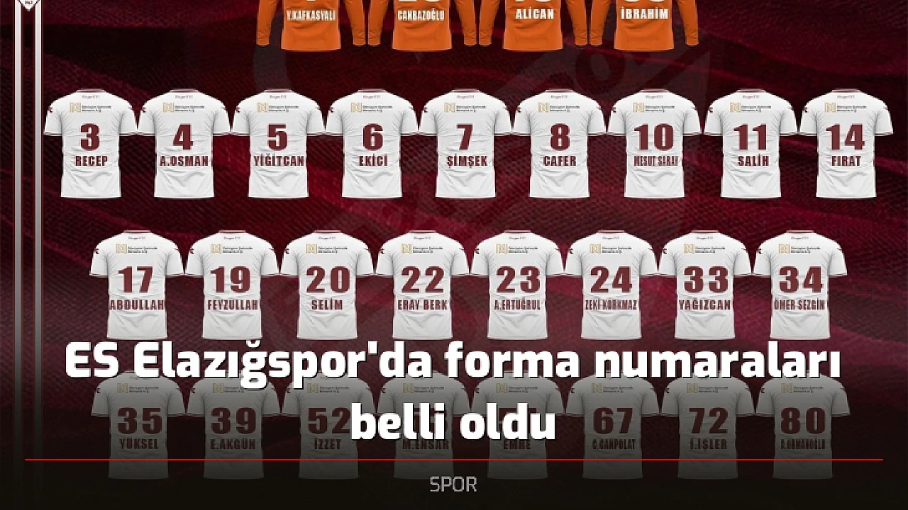 TFF 3. Lig 1. Grupta yeni sezonda mücadele edecek olan Entegre Solar Elazığspor’da futbolcuların giyecekleri forma numaraları belli oldu. Sezonun ilk maçına pazar günü çıkacak olan bordo-beyazlılarda şehrin plaka kodu olan 23’ü bu sezon Elazığlı ön libero Ahmet Ertuğrul Öztürk taşıyacak. Kaptan Mesut Saray yeni sezonda 10 numaralı formayı tercih ederken, kaleci Hakan Canbazoğlu 26 numaralı formayla sahada olacak.