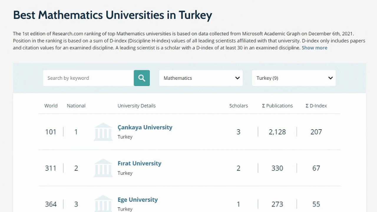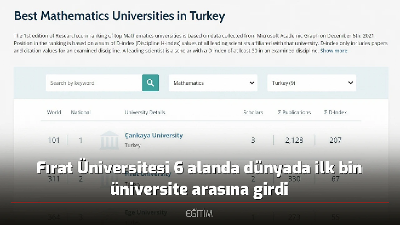 Alan bazlı olarak “research.com” internet sitesi tarafından D-indeks (disiplin H-indeks) ve bibliyometrik göstergeler dikkate alınarak belirlenen üniversitelerin dünya sıralamaları açıklandı. Yapılan bilimsel değerlendirmeler sonucunda Fırat Üniversitesi makine mühendisliği ve havacılık alanında Türkiye’de 1. dünyada 102., veterinerlik alanında Türkiye’de 1. dünyada 266., matematik alanında Türkiye’de 2. dünyada 311., biyoloji ve biyokimya alanında Türkiye’de 3. dünyada 932., bilgisayar bilimleri alanında Türkiye’de 4. dünyada 815. ve malzeme bilimi alanında Türkiye’de 7. dünyada 715. sırada yer aldı.