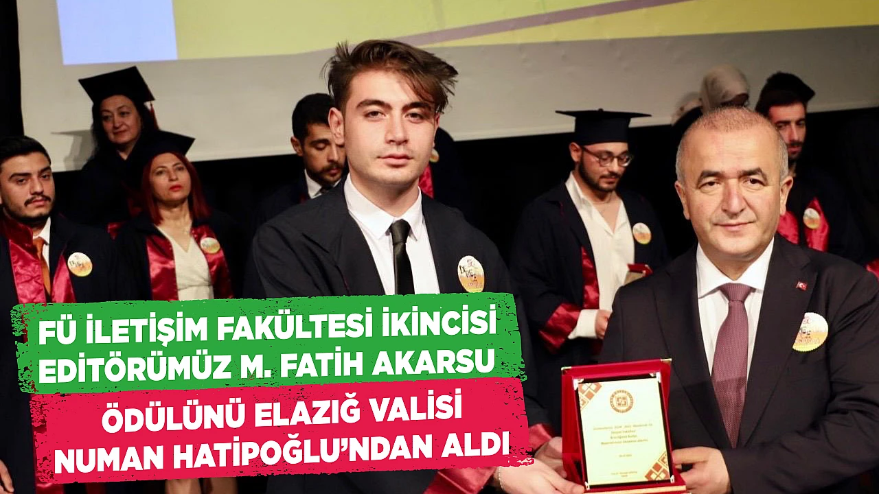 Fırat Üniversitesinde her yıl geleneksel olarak düzenlenen Derece Ödülleri Töreni, bu yıl da büyük bir coşku ve gururla gerçekleştirildi. Fırat Üniversitesi İletişim Fakültesi'ni ikincilikle bitiren haber editörümüz M. Fatih Akarsu ödülünü Elazığ Valisi Numan Hatipoğlu'nun elinden aldı.