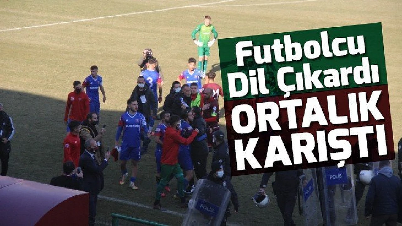 Elazığspor'un sahasında Karabükspor'a 2-0 yenildiği maçın son dakikasında kırmızı kart görerek oyundan atılan Karabüksporlu futbolcunun protokol tribününe dil çıkarmasının ardından ortalık bir anda karıştı.
