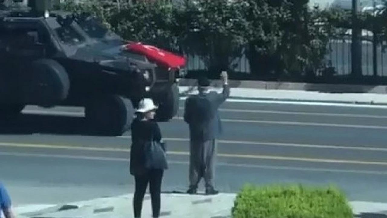Elazığ'da yapılan 30 Ağustos Zafer Bayramı provasında Türk Bayrağı süslenmiş tören mangasını gören yaşlı amca, araçlara el sallayıp uğurladı.