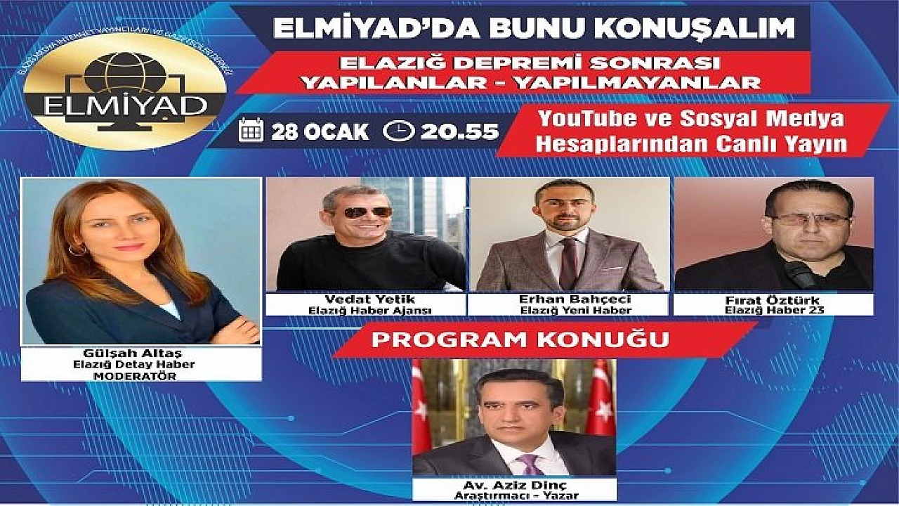 Elazığ Medya İnternet Yayıncıları ve Gazetecileri Derneği kısa adıyla ELMİYAD, 24 Ocak Depremi sonrasında yapılanlar ve yapılmayanları canlı yayında ele alacak.
