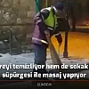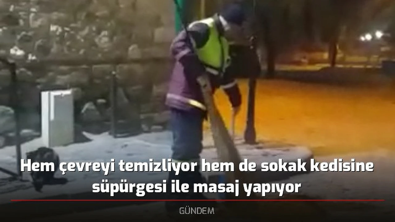 Hem çevreyi temizliyor hem de sokak kedisine süpürgesi ile masaj yapıyor