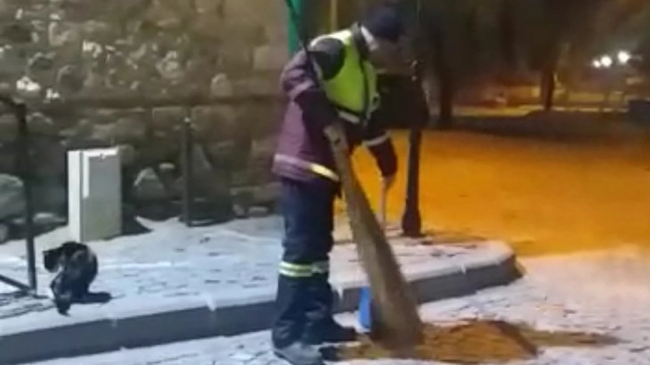 Elazığ’ın tarihi mahallesi Harput’ta temizlik görevlisi olan Metin Demirtaş, 2 yıl önce bir sokak kedisi ile dostluk kurdu. Kedi her sabah saat 6’da otobüs durağının önüne gelerek Demirtaş’ı bekliyor. Demirtaş da her sabah işe başlamadan önce kediye süpürgesi ile mesaj yapıyor. Ardından işe başlayan Demirtaş’ın yanından kedi bir an olsun ayrılmıyor. O anları Harput Mahalle Muhtarı Zülküf Demirpolat, cep telefonu kamerası ile çekerek sosyal medyaya yükledi.