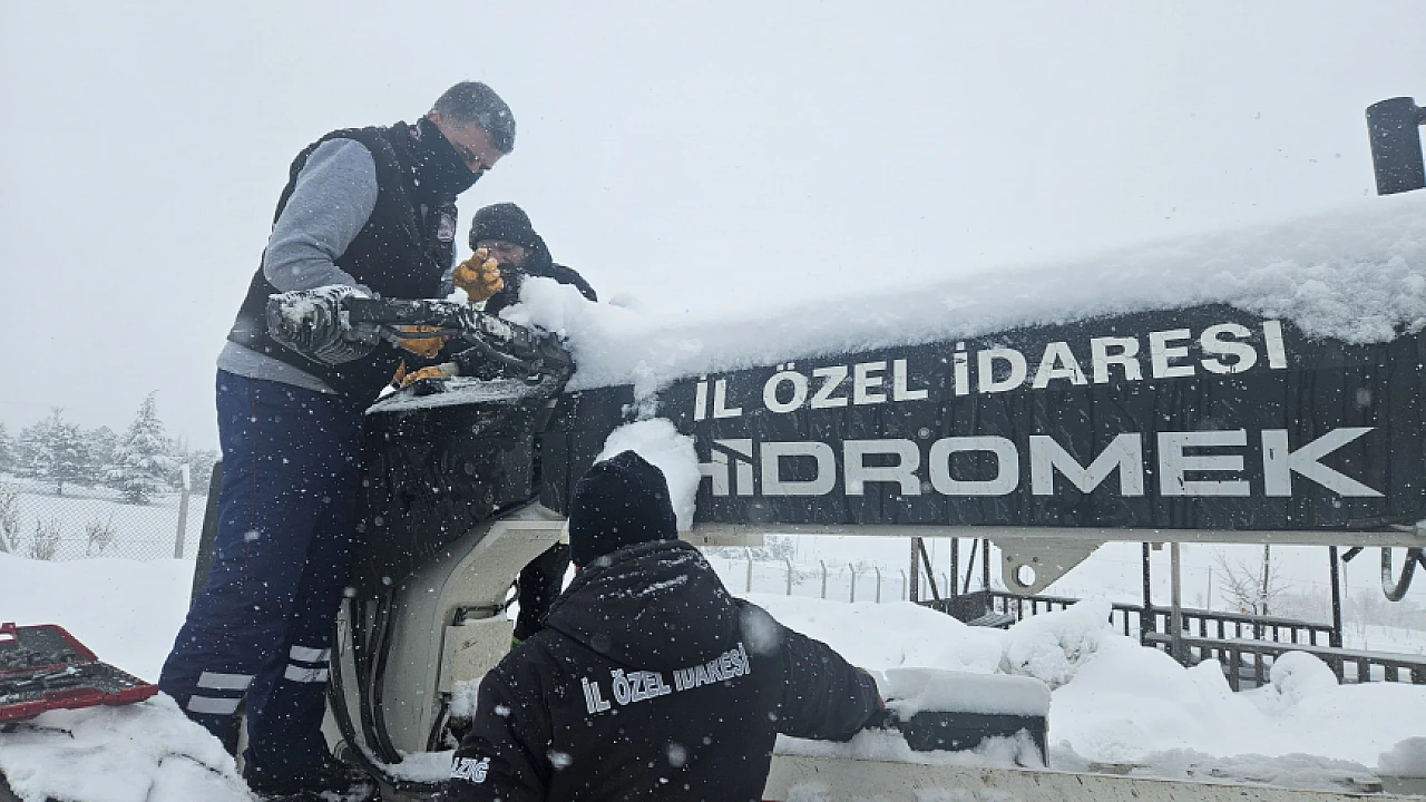 Elazığ İl Özel İdaresi Makine İkmal ve Bakım Onarım Müdürlüğü ekipleri, yoğun kış şartlarının etkili olduğu bölgelerde karla mücadele çalışmalarının aksamaması için araç ve ekipmanlara sahada bakım ve onarım yapıyor.