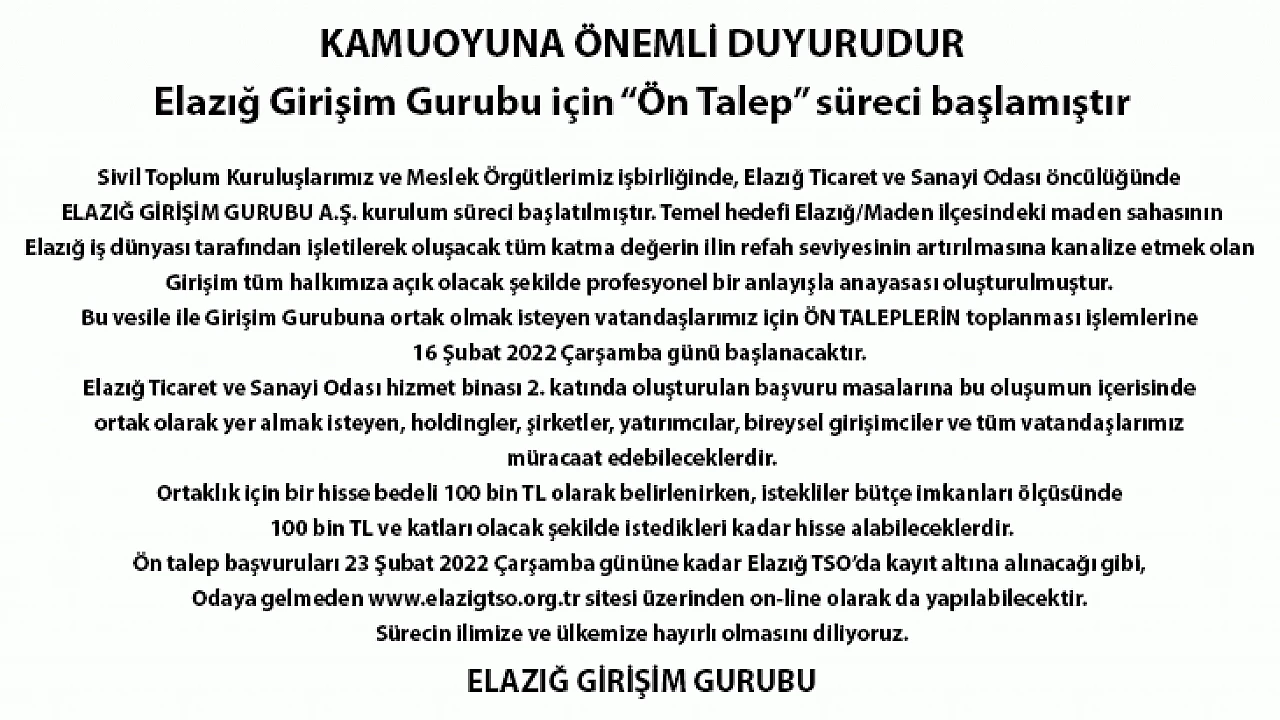 Sivil Toplum Kuruluşlarımız ve Meslek Örgütlerimiz işbirliğinde, Elazığ Ticaret ve Sanayi Odası öncülüğünde ELAZIĞ GİRİŞİM GURUBU A.Ş. kurulum süreci başlatılmıştır. Temel hedefi Elazığ/Maden ilçesindeki maden sahasının Elazığ iş dünyası tarafından işletilerek oluşacak tüm katma değerin ilin refah seviyesinin artırılmasına kanalize etmek olan Girişim tüm halkımıza açık olacak şekilde profesyonel bir anlayışla anayasası oluşturulmuştur.