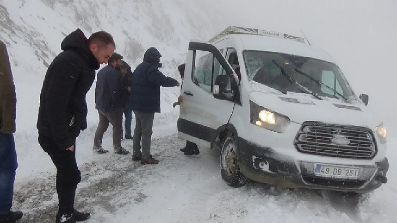 Muş’ta 9 köy ve 22 mezranın ulaşımının sağlandığı Üçevler grup köy yolunun Çavuştepe mevkiinde aniden bastıran kar yağışı, fırtına ve tipi nedeniyle 10 kişi köy minibüsünde mahsur kaldı. Kar kalınlığının yer yer 20-25 santimetreye ulaştığı yolda, Ağıllı köyüne gitmekte olan köy minibüsü kar ve tipi nedeniyle ilerleyemedi. Yolda mahsur kalan vatandaşlar, jandarmadan yardım istedi. Jandarmanın, durumu Muş İl Özel İdaresine bildirmesi üzerine bölgeye gelen ekipler, ilerlemekte güçlük çektikleri noktada iş makinesine zincir takmak zorunda kaldı. 3 saat mahsur kalan vatandaşlara ulaşan ekipler, köy minibüsünü bulunduğu yerden çıkardı. Karla kaplı yolu açan ekipler, vatandaşları köylerine zorlukla ulaştırdı.