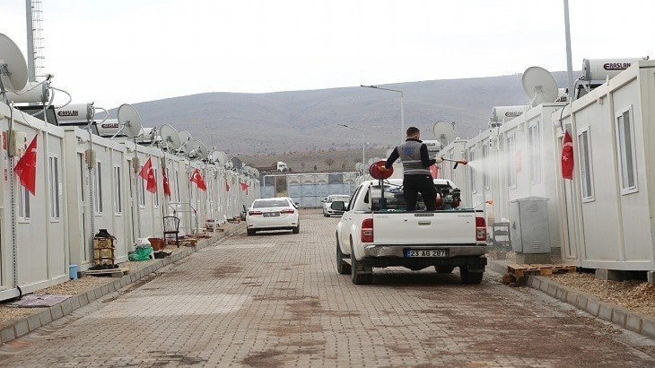 Yeni Korona virüs (COVID 19) salgınının Türkiye'de de görülmesinin ardından Elazığ Belediyesi Veteriner İşleri Müdürlüğü bünyesinde oluşturulan ekipler tarafından şehrin dört bir yanında toplu kullanım alanları ile kurum ve kuruluşlara yönelik dezenfekte çalışmalarına devam ediliyor. Ekipler tarafından 24 Ocak’ta Elazığ’da yaşanan depremin ardından evleri yıkılan ve hasar gören vatandaşların yaşamlarını sürdürdüğü konteyner kentlerde dezenfekte çalışması gerçekleştiriliyor. Yürütülen çalışma kapsamında depremzedelerin yaşamlarını sürdürdüğü konteynerler, çevreleri ve konteyner kentlerde bulunan çocuk oyun parkları titizlikle dezenfekte ediliyor.