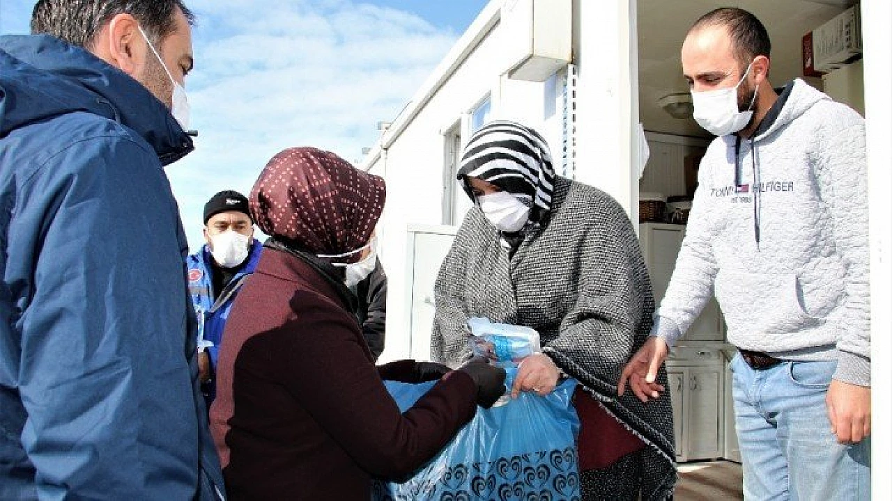 Elazığ'da meydana gelen depremin ardından geçici barınma merkezi olarak kurulan konteyner kentlerde kalan ailelere battaniye, maske ve internet kartı gibi çeşitli desteklerde bulunuldu.