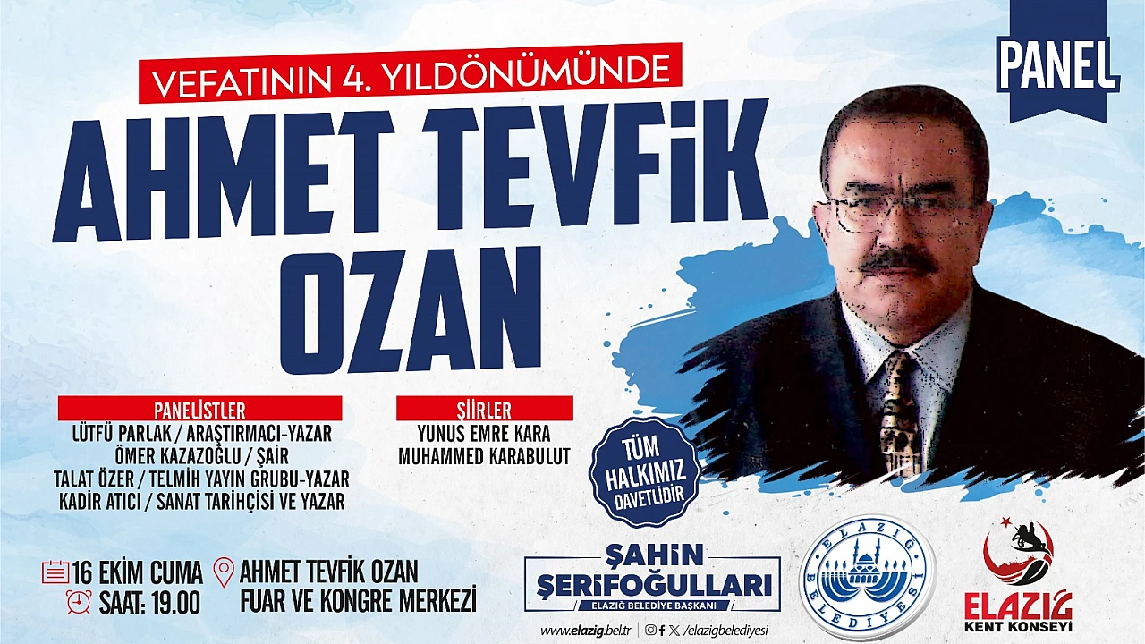 Elazığ Belediyesi ve Elazığ Kent Konseyi iş birliği ile 16 Ocak Cuma günü düzenlenecek panelde, Şair ve Yazar Merhum Ahmet Tevfik Ozan anılacak.