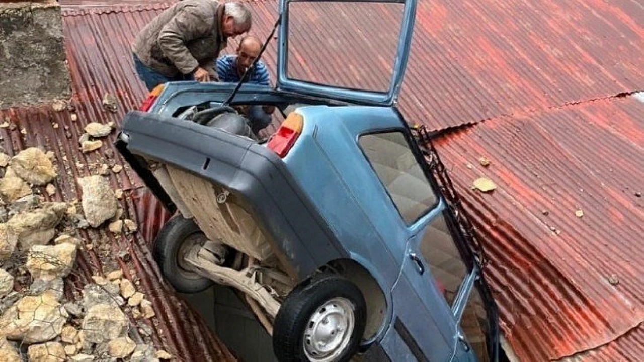 Mersin'in Erdemli ilçesinde yağmur esnasında tepeden aşağıya inerken keskin virajda sürücüsünün direksiyon hakimiyetini kaybettiği otomobil yoldan çıkıp bir evin çatısına düştü. Çatıdan içeri girip askıda kalan otomobilden çıkarılan ve yaralanan sürücü tedavi altına alındı.