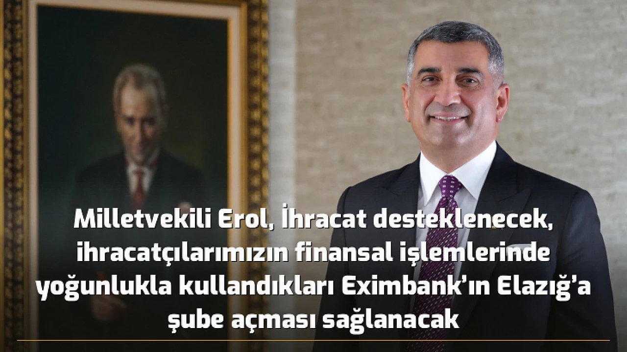 - Milletvekili Erol, İhracat desteklenecek, ihracatçılarımızın finansal işlemlerinde yoğunlukla kullandıkları Eximbank'ın Elazığ'a şube açması sağlanacak