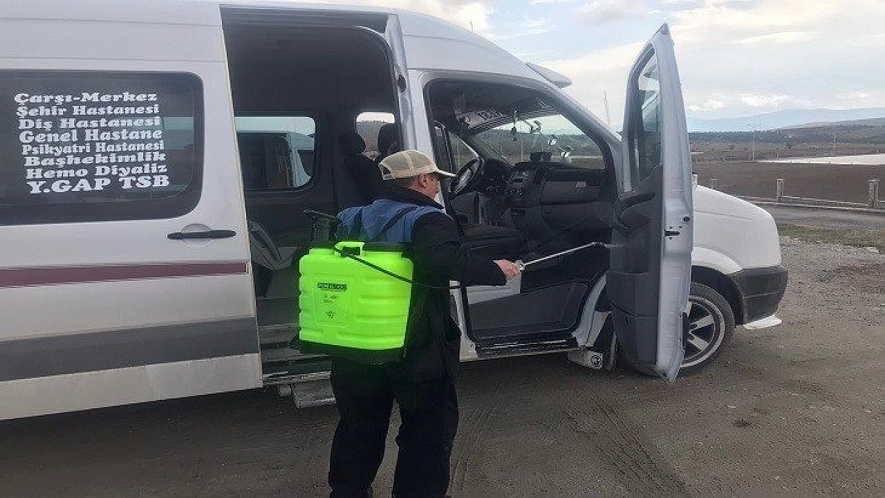 Bu kapsamda Elazığ'da hizmet veren minibüsler, taksiler ve duraklar dezenfektanlarla ilaçlandı.