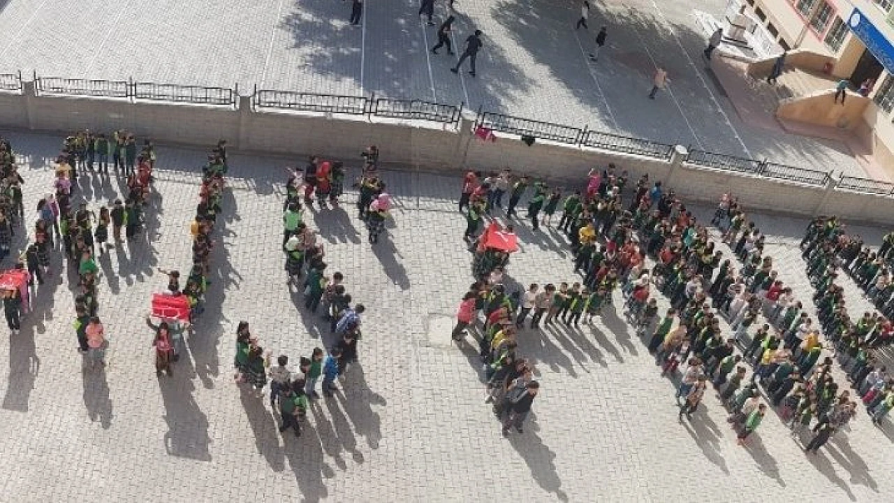 Cumhurbaşkanı Recep Tayyip Erdoğan’ın verdiği talimatla Türk Silahlı Kuvvetlerinin başlattığı Barış Pınarı Harekatı’na bir destek de Şehit Fethi Murat İlkokulu öğrencilerinden geldi. Okul bahçesinde bir araya gelen öğrenciler, öğretmenlerinin koordinesinde bedenleri ile ‘Barış Pınarı’ yazdı. Minik öğrenciler daha sonra hep bir ağızdan ‘En büyük asker bizim asker’ diyerek Mehmetçiğe selam gönderdi.