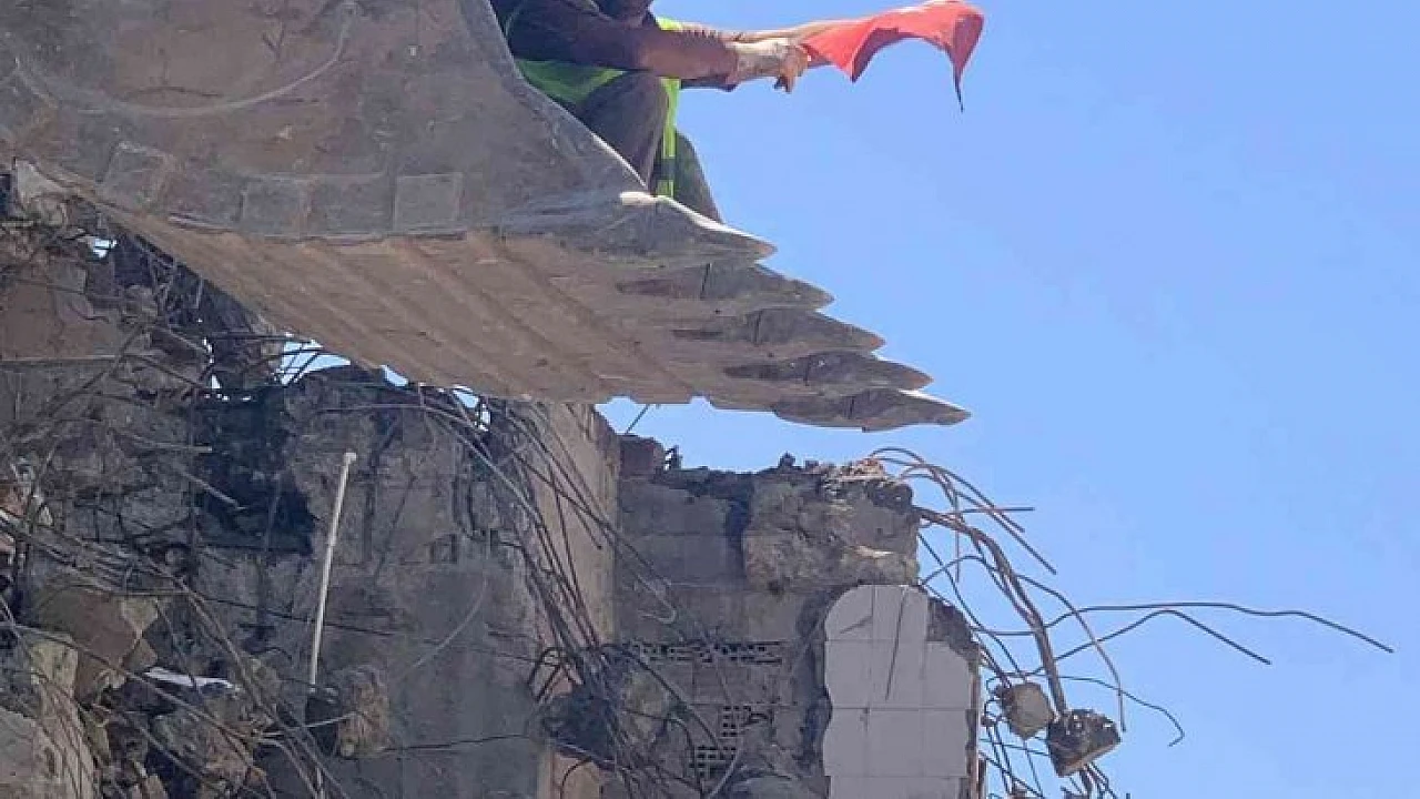 Elazığ'da deprem sonrasında ağır hasarlı binaların yıkımı devam ederken, bir işçinin fark edip kepçe yardımı ile Türk bayrağını enkaz alanından alması dikkat çekti.