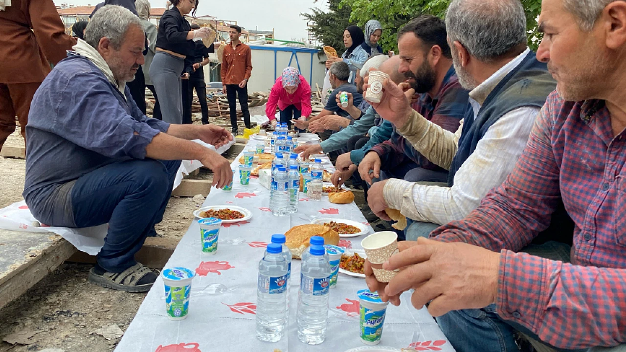 Bölüm öğretim üyesi Doç. Dr. Mehmet Fatih Çakar'ın öncülüğünde inşaat işçilerini ziyaret eden öğrenciler, 1 Mayıs'ta çalışan inşaat ustalarıyla yemek yiyip sohbet etti.
