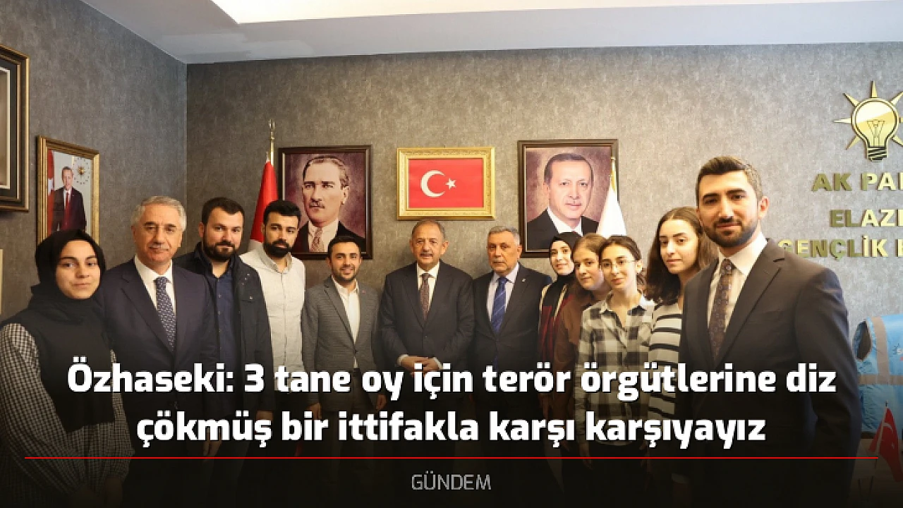 AK Parti Genel Başkan Yardımcısı Mehmet Özhaseki, Elazığ ziyaretinde yaptığı açıklamada '3 tane oy için terör örgütlerine diz çökmüş bir ittifakla karşı karşıyayız. Her ne kadar saklamaya çalışırlarsa çalışsınlar bu gerçek yüzlerinde ortaya çıkıyor.' dedi.