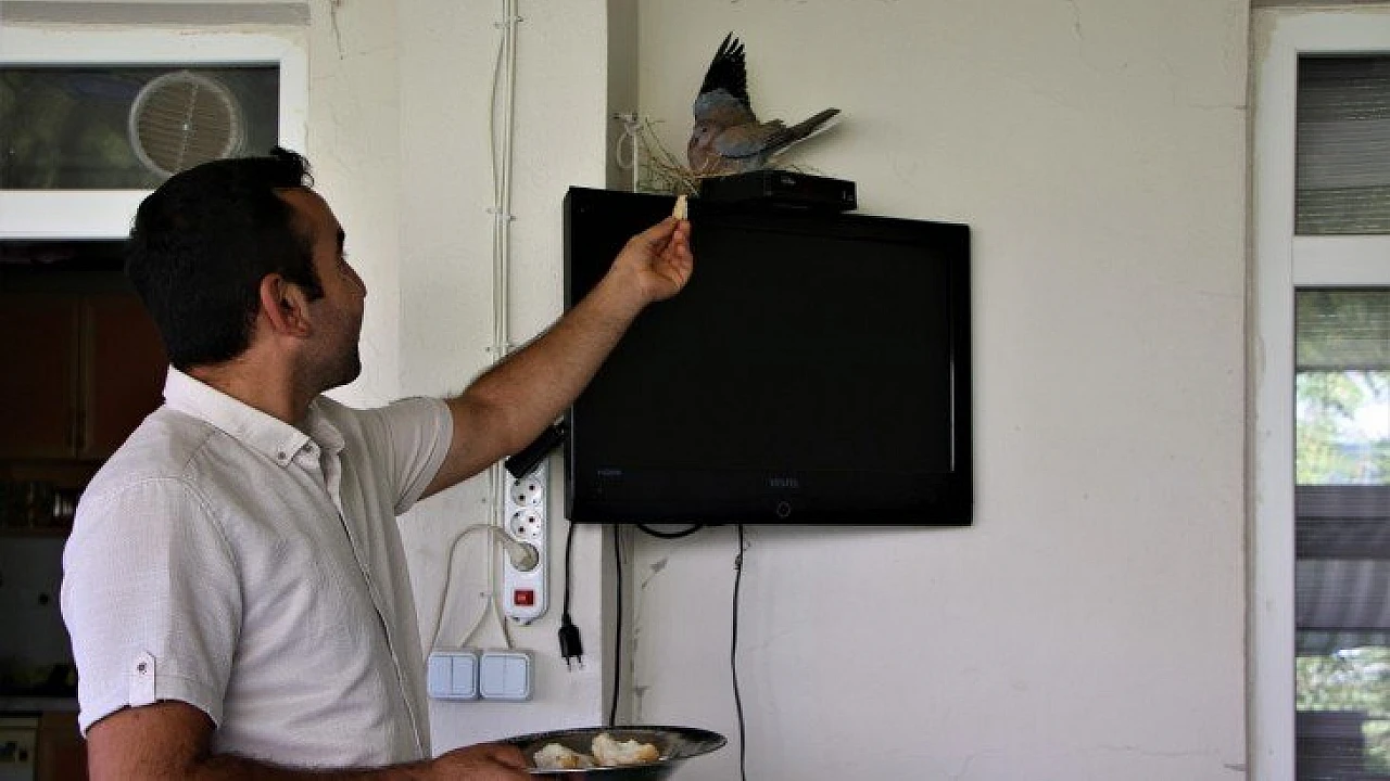Son iki yıldır güvercin ve kumruların balkonda yuva yaptığını ifade eden Savaş Kayaoğlu, “Yaklaşık 5 yıldır bu evde oturuyorum. Baharın gelmesiyle birlikte kumru, üçüncü kez yuva yaptı. Biz bir hafta tatile gittik ve eve döndüğümüzde burada televizyonun üstüne yuva yaptığını gördük. Daha önce, balkonun daha tenha köşelerinde yuva yaptığını görmüştük ama bu defa daha yakına gelmiş. Artık bizim ailenin bir parçası olmuş. Evden kimseden korkmuyor, uçmuyor. Bizler de yemeğini, suyunu veriyoruz” dedi.