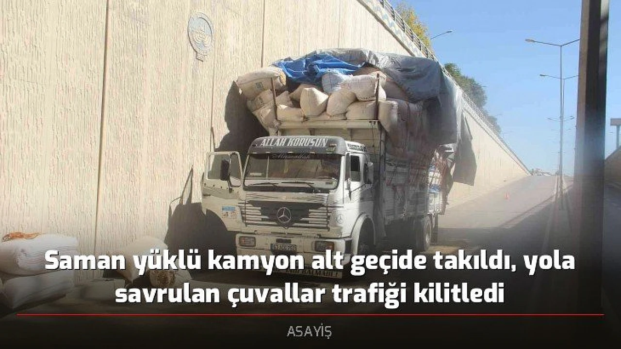 Elazığ'da saman yüklü kamyon, kapasitesinden fazla yük alması nedeniyle alt geçitten geçemedi. Alt geçide takılan saman dolu çuvallar yola savrulurken, trafik akışında aksamalar yaşandı.
