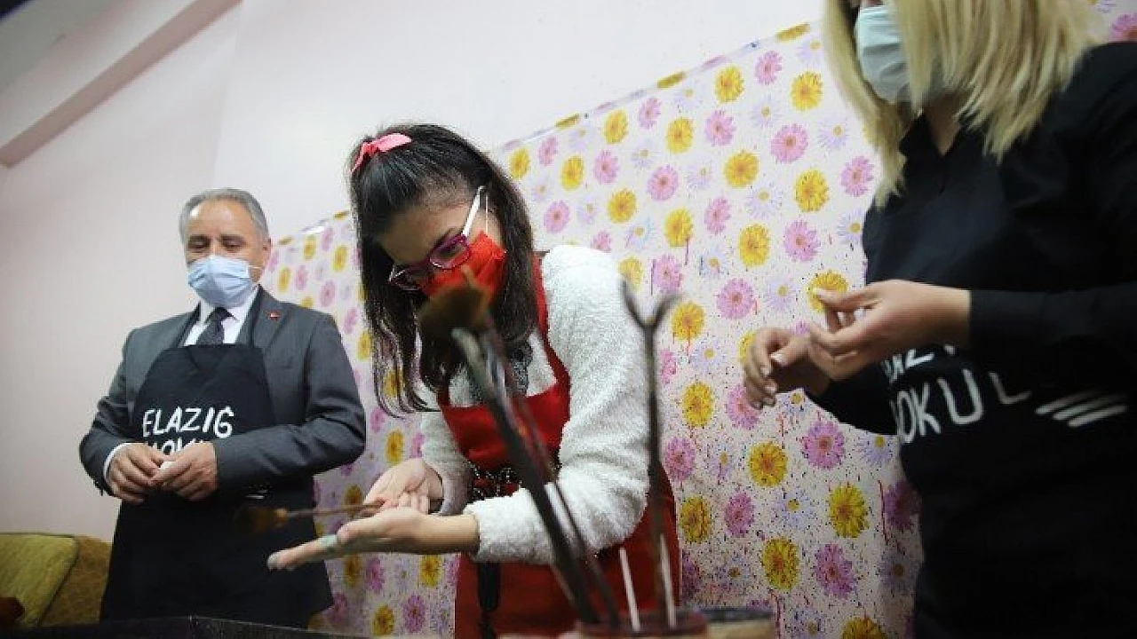 İl Milli Eğitim Müdürlüğü özellikle dezavantajlı kadınların sanat ile buluşması için “Kadının Hayata Güçlü Dokunuşu’ projesini hayata geçirdi. Bu kapsamda Halk Eğitim Merkezi bünyesine görev yapan usta öğreticiler tarafından verilen destekle özel bireyler ve annelerine ‘Ebru’ sanatı eğitimi verilmeye başlandı. Elazığ Anaokulu Çok Amaçlı Spor Salonu’nda verilen eğitime katılan anneler hem çocuklarıyla zaman geçiriyor hem de öğrendiği sanatla ürünler ortaya çıkartarak ekonomik kazanç elde ediyor. Bugünkü eğitime katılan İl Milli Eğitim Müdürü Feyzi Gürtürk, burada anne ve çocuklarla sohbet ederek çeşitli hediyeler verdi.