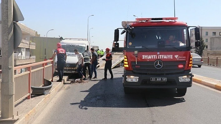 Şanlıurfa’da aynı yönde seyreden iki aracın çarpışması sonucu meydana gelen trafik kazasında kamyonet köprüde asılı kaldı. Korkutan kazada bir sürücü yaralandı.