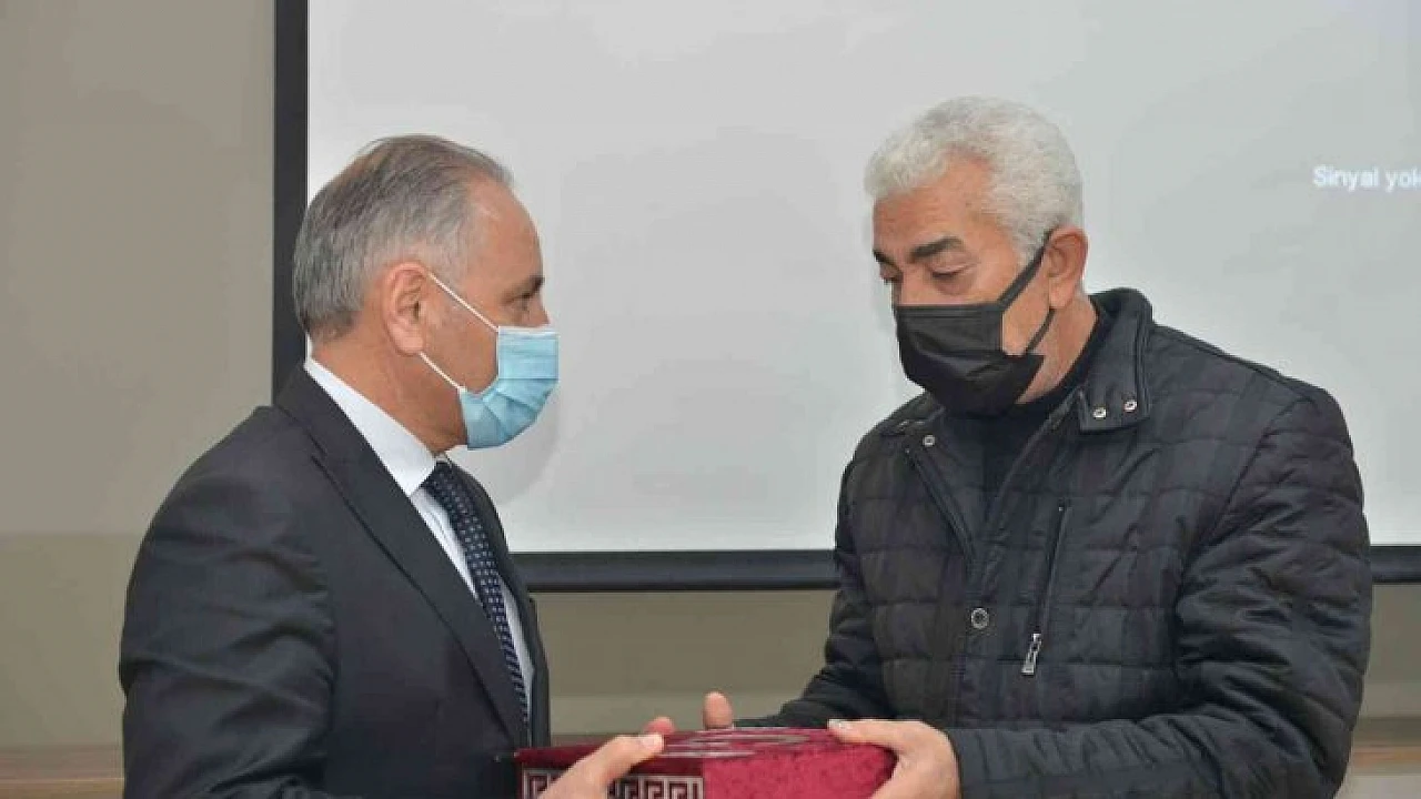 Programda Kur’an-ı Kerim tilavetinin ardından Milli Eğitim Müdürü Feyzi Gürtürk, Şehit Faruk Barut’un babasına Kur’an-ı Kerim ve Türk bayrağı armağan etti.