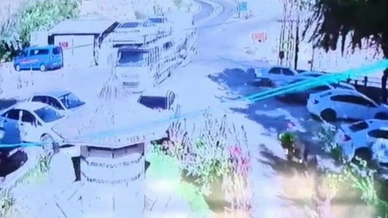 Elazığ'da sıfır araç taşıyan tır freninin boşalması sonucu otoparka dalarak 5 aracı biçti, kazada 1 kişi yaralandı. O anlar saniye saniye güvenlik kameralarına yansıdı.